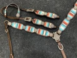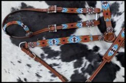 Double stitched leather browband headstall and breast collar set. Headstall features acorn tooling on browband and cheeks. Contoured breastcollar features matching acorn tooling. Headstall Comes with 5/8″ X 7′ leather split reins.