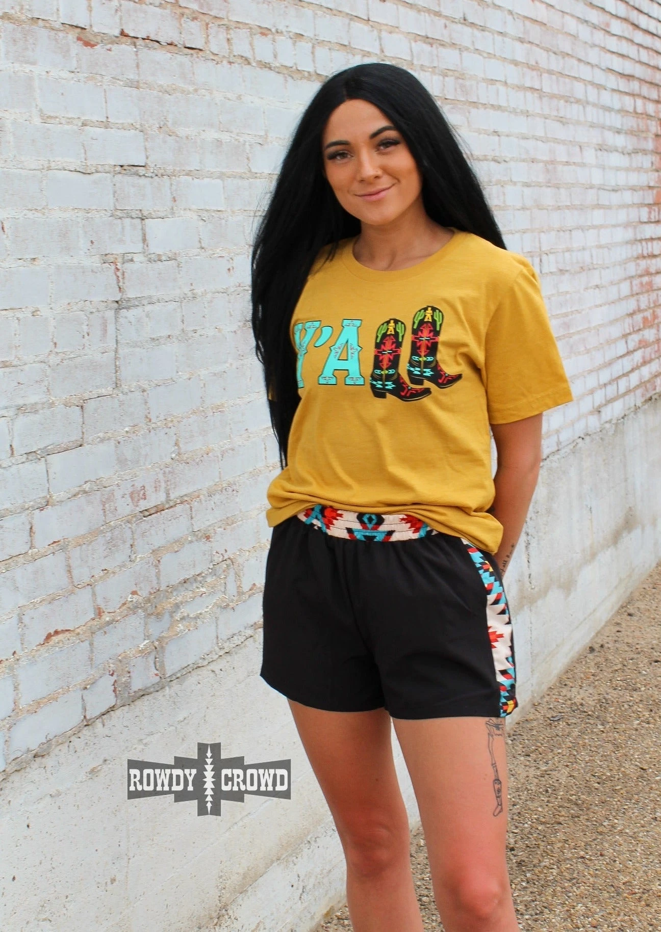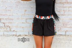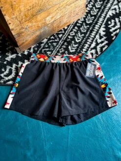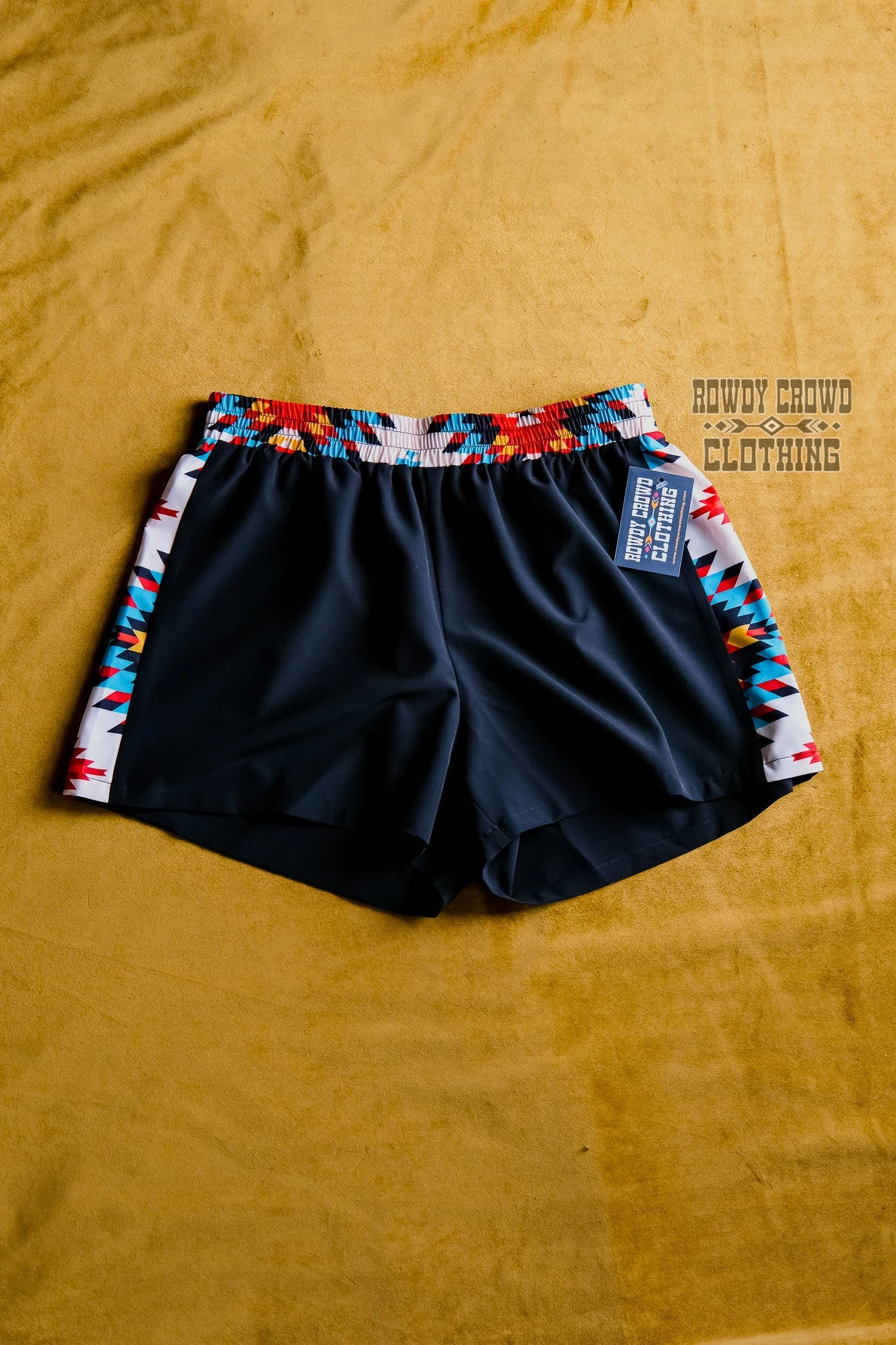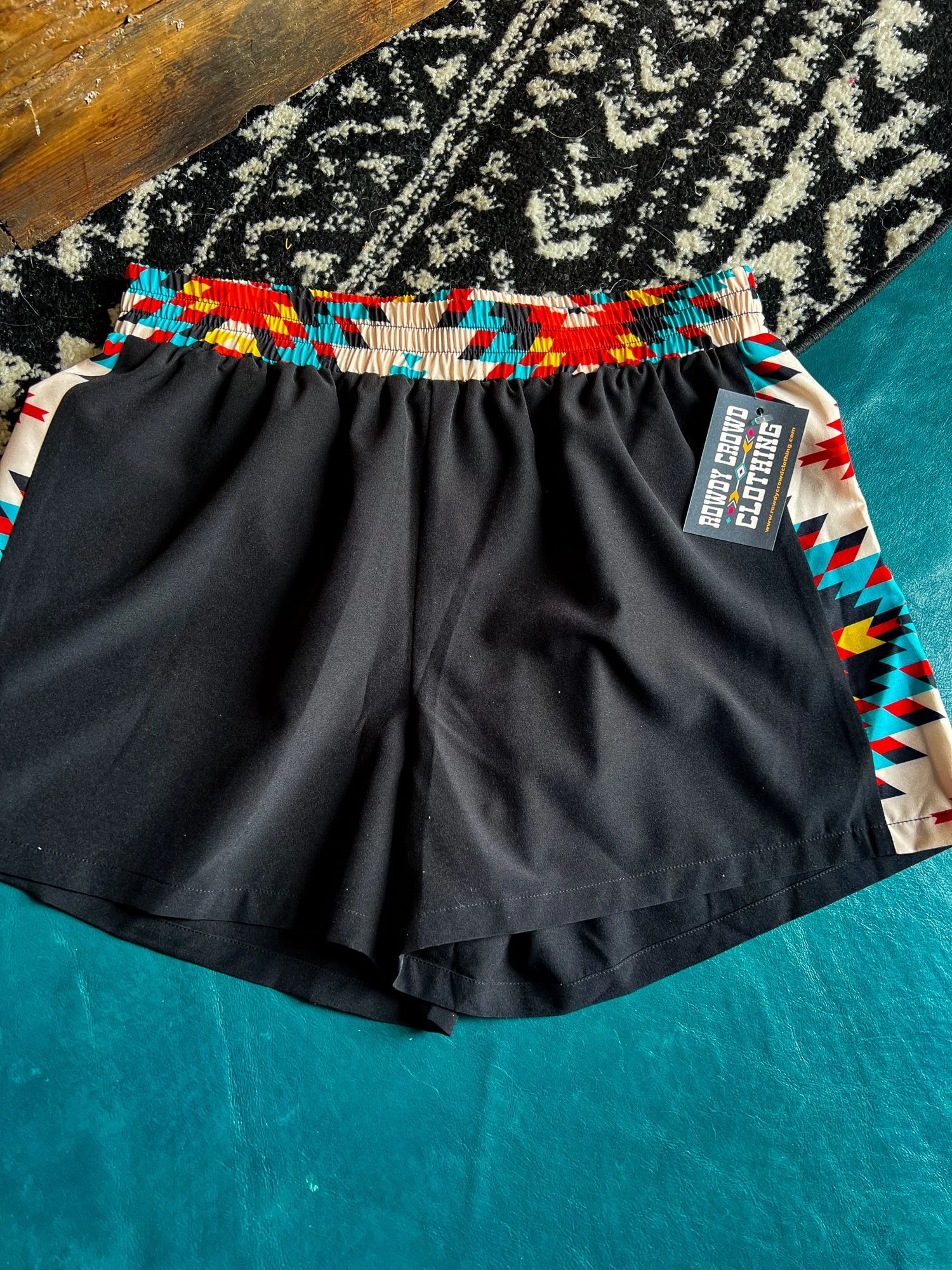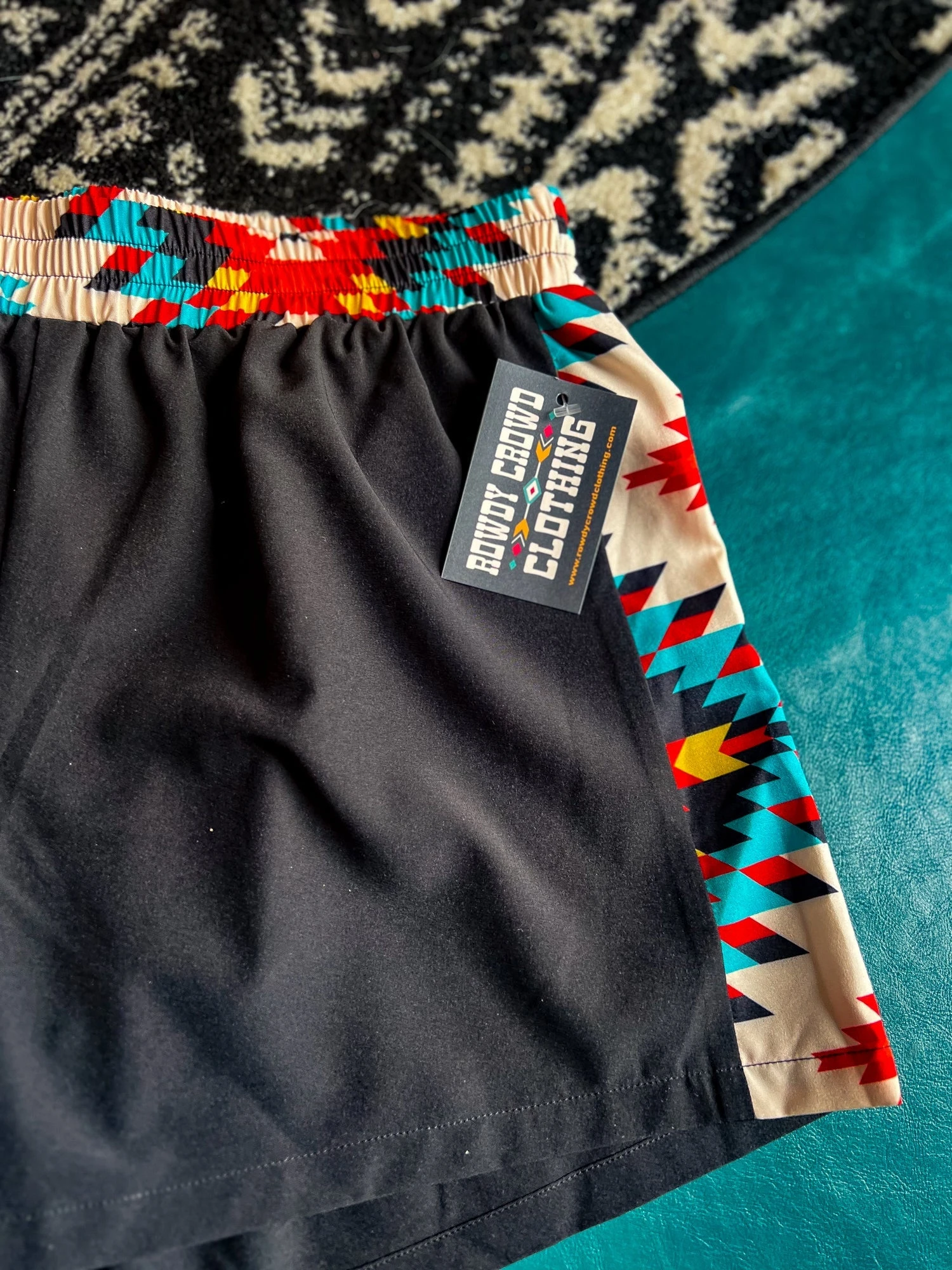 Black athletic shorts with orange, red, yellow, turquoise, and black Aztec detail. A stretchy waistband for a comfortable fit can be dressed up or down.