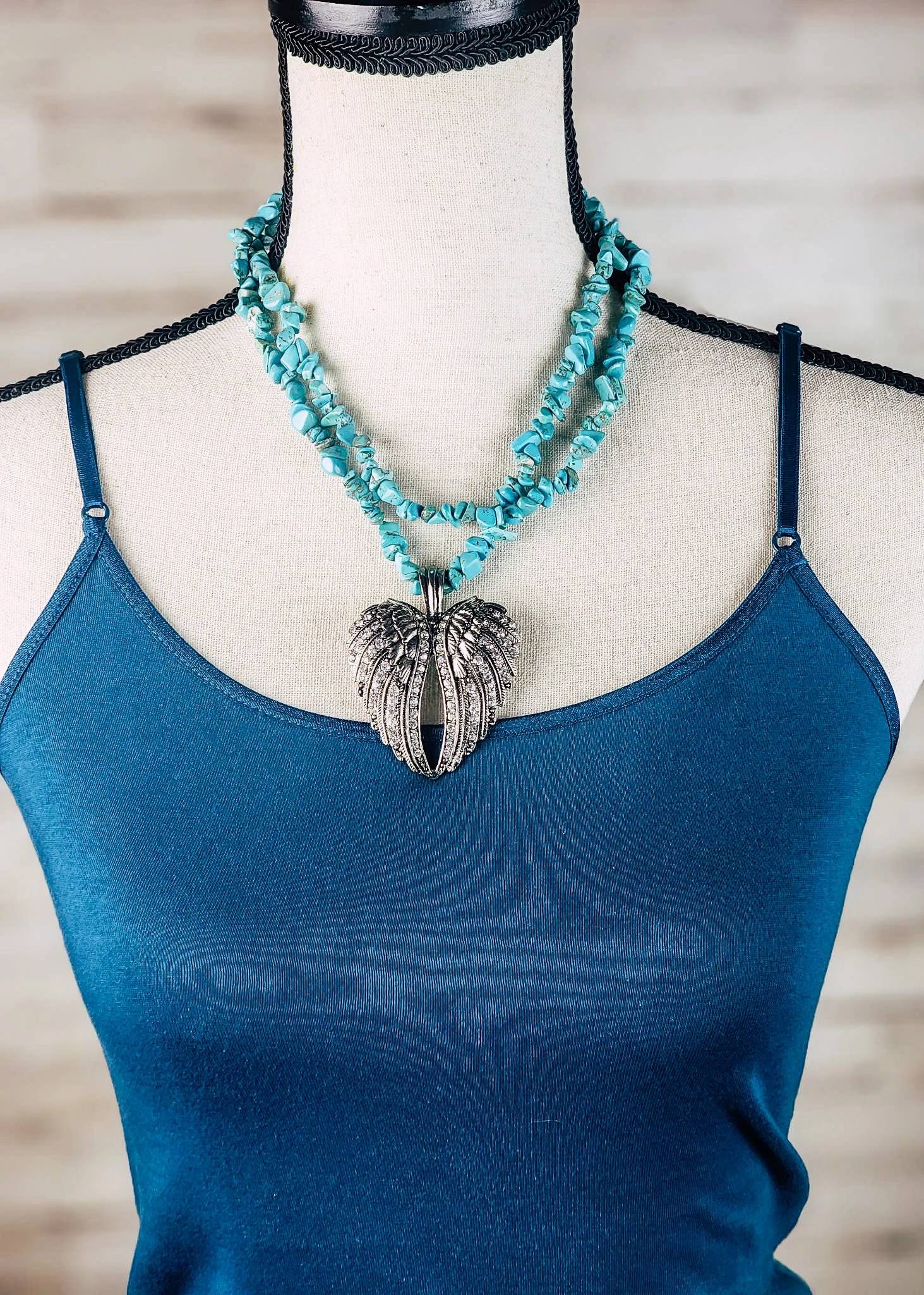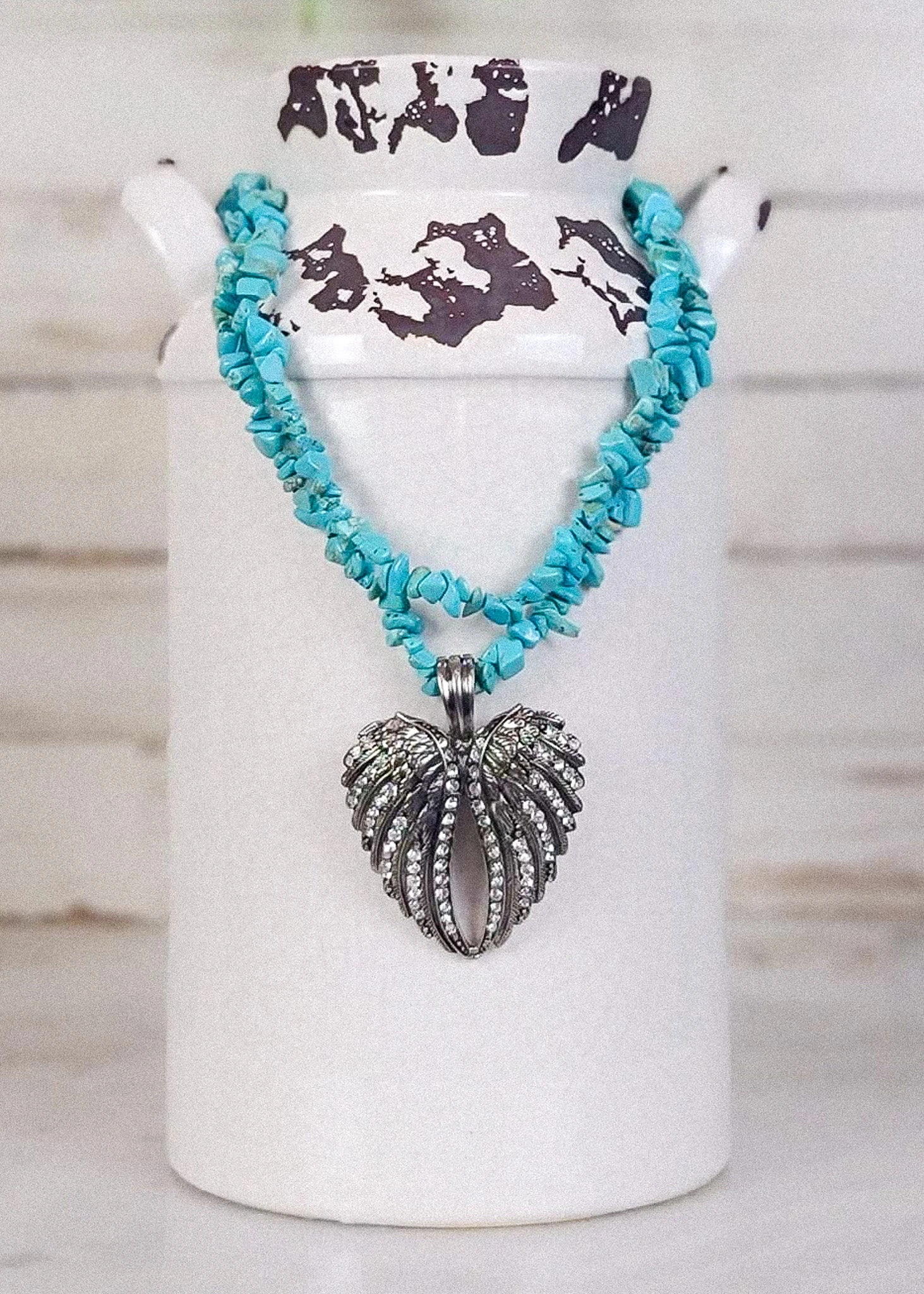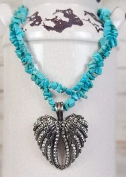 Adorn yourself with the Angel Wing Heart! This unique piece of jewelry is crafted with beautiful turquoise to add a bold touch of color to your wardrobe. Wear it to make a statement and show your love for fashion.