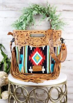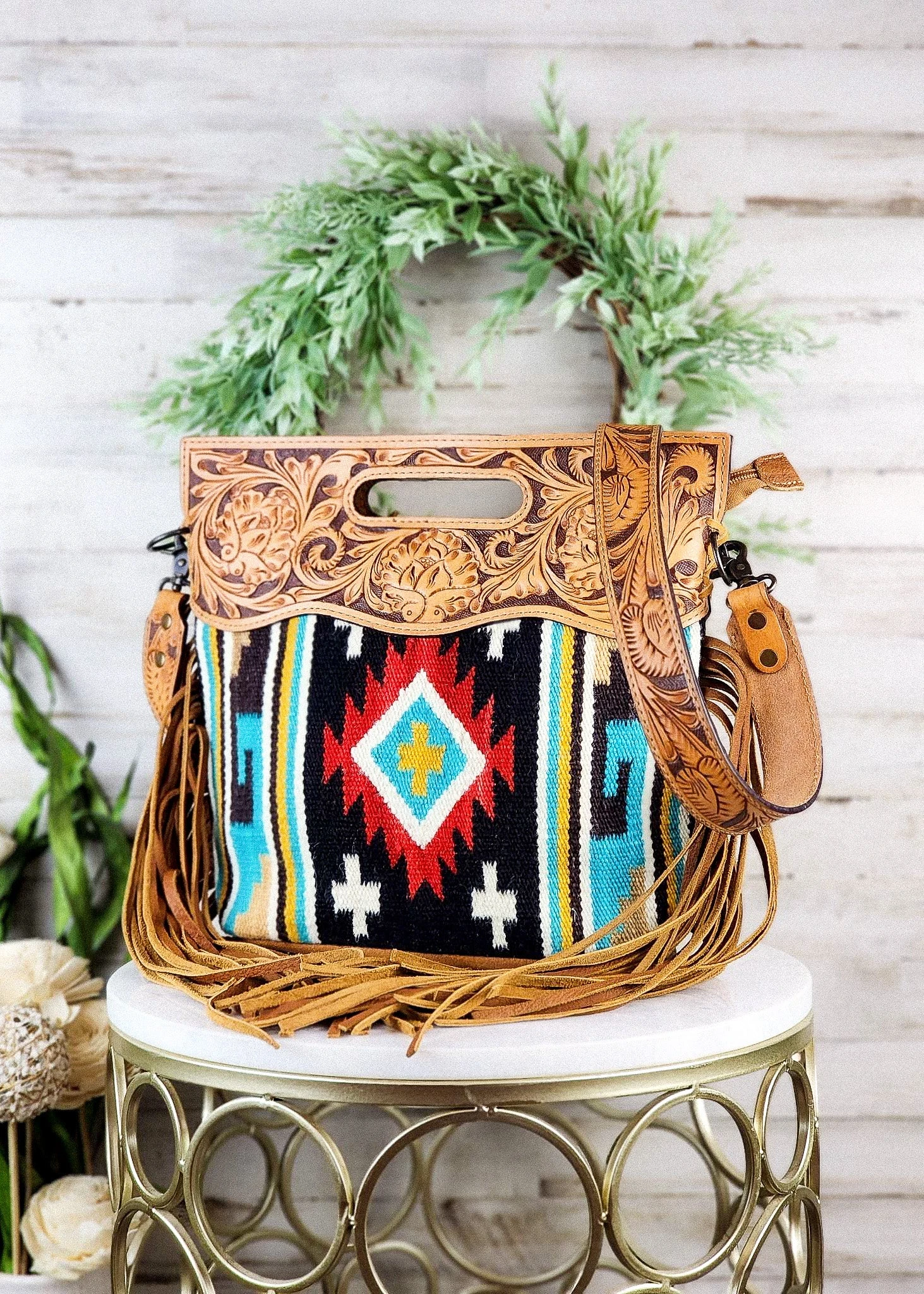 Bring out your inner cowgirl with our Bandelier Aztec Fringe Handbag. Tooled leather provides an authentically-textured finish to the bold, geometric patterns of the bag’s iconic Aztec design. Swinging fringe adds a dynamic element, making it the perfect accent to any look. Showcase your adventurous spirit with this groundbreaking design!
