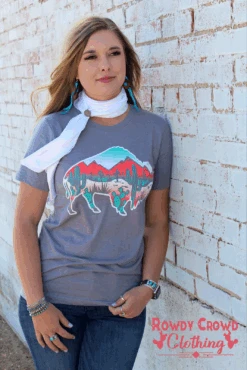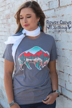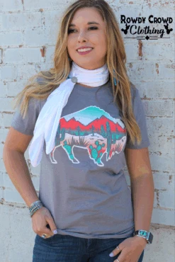 This tee is an all time favorite! It is on a heather storm grey tee, that is lightweight and stretchy. The turquoise, pink and white colors in the buffalo are bright and vibrant and make the inside desert scene POP! This is a true to size unisex fit tee and the design is a screen print so won’t fade or peel after washing.
