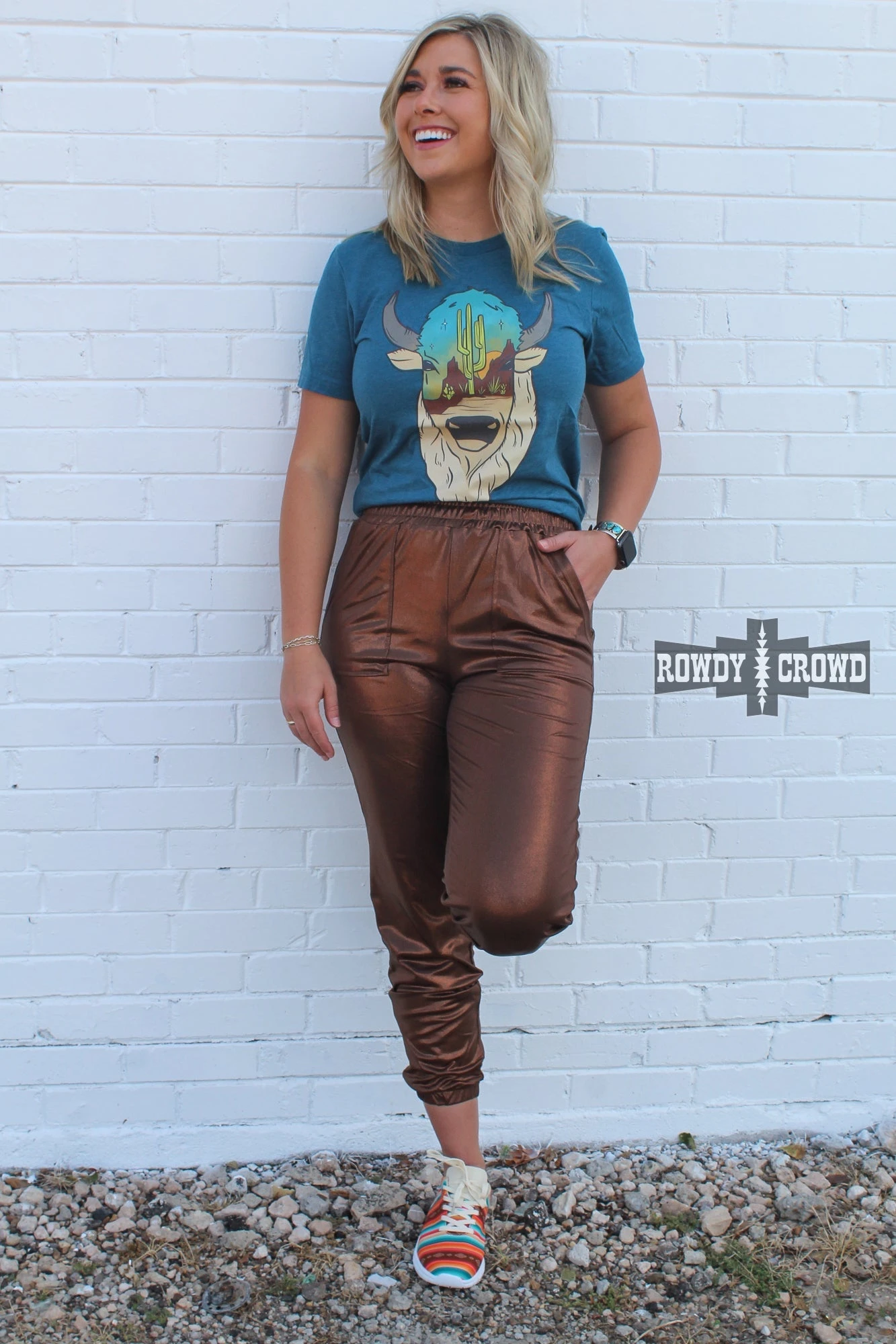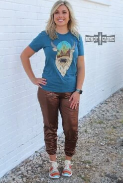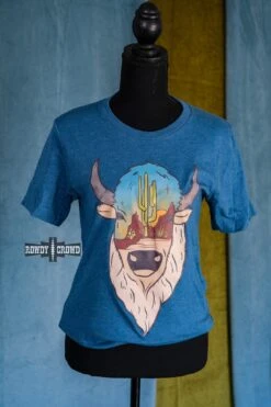 Calling all buffalo lovers, this tee is a must for your closet! On a heather deep teal tee that is a true to size unisex fit with a stretchy lightweight material. The detail on the buffalo head and in the desert scenery is what makes this tee so special! The design is a screen print so won’t fade or peel after washing.