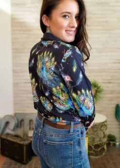 Bring out your inner cowgirl with this boldly colorful, rodeo-inspired Peacock Long Sleeve Button Down. Show off your wild side and make a statement with this eye-catching piece!