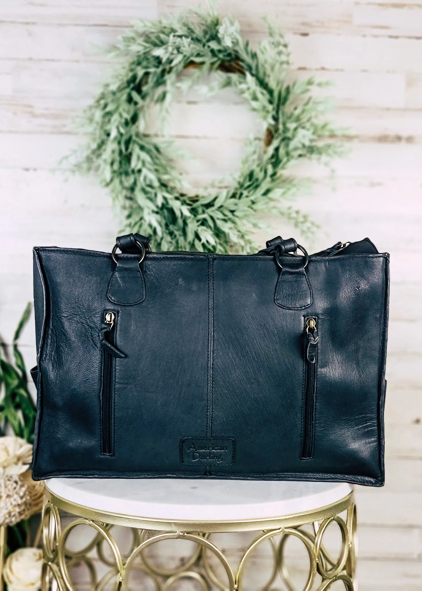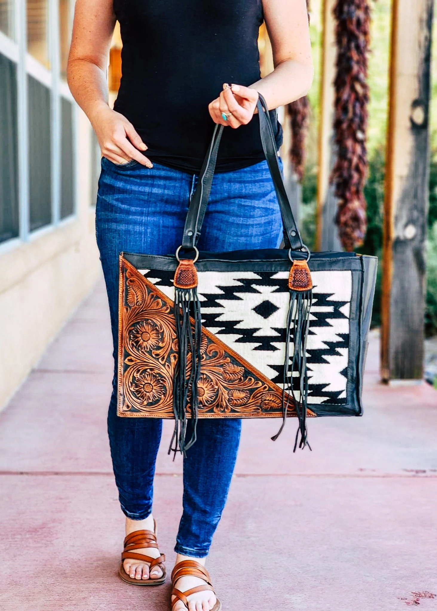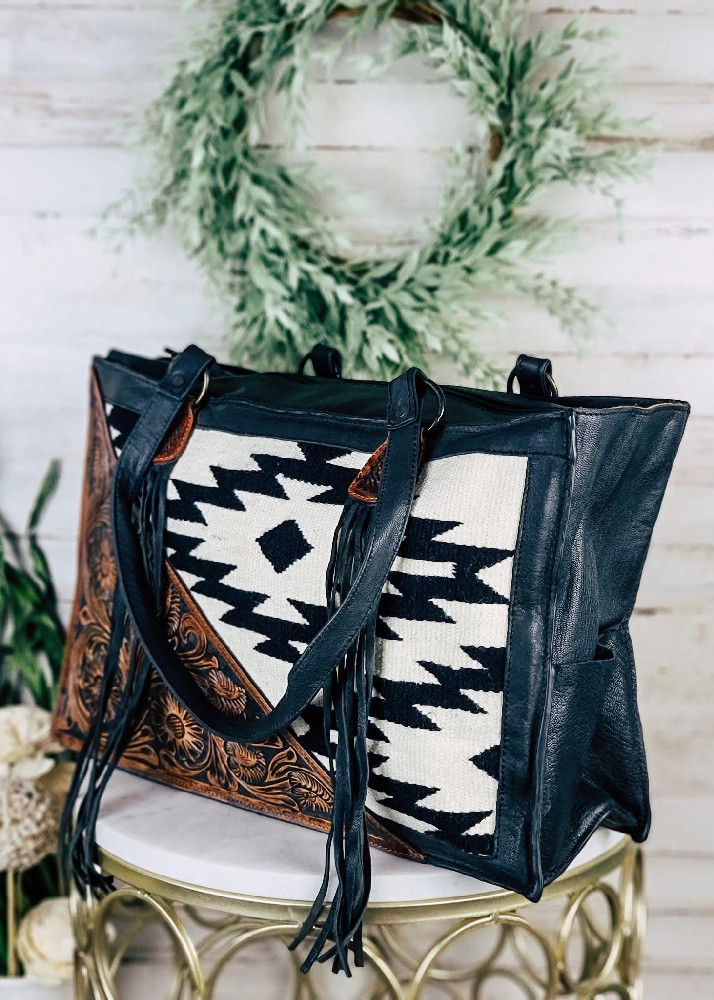This Concealed Carry Black & White Aztec Tote Handbag is the perfect blend of classic style and modern sophistication. Crafted with a chic southwestern pattern, this tote is perfect for the modern cowgirl. Make an impression wherever you go!