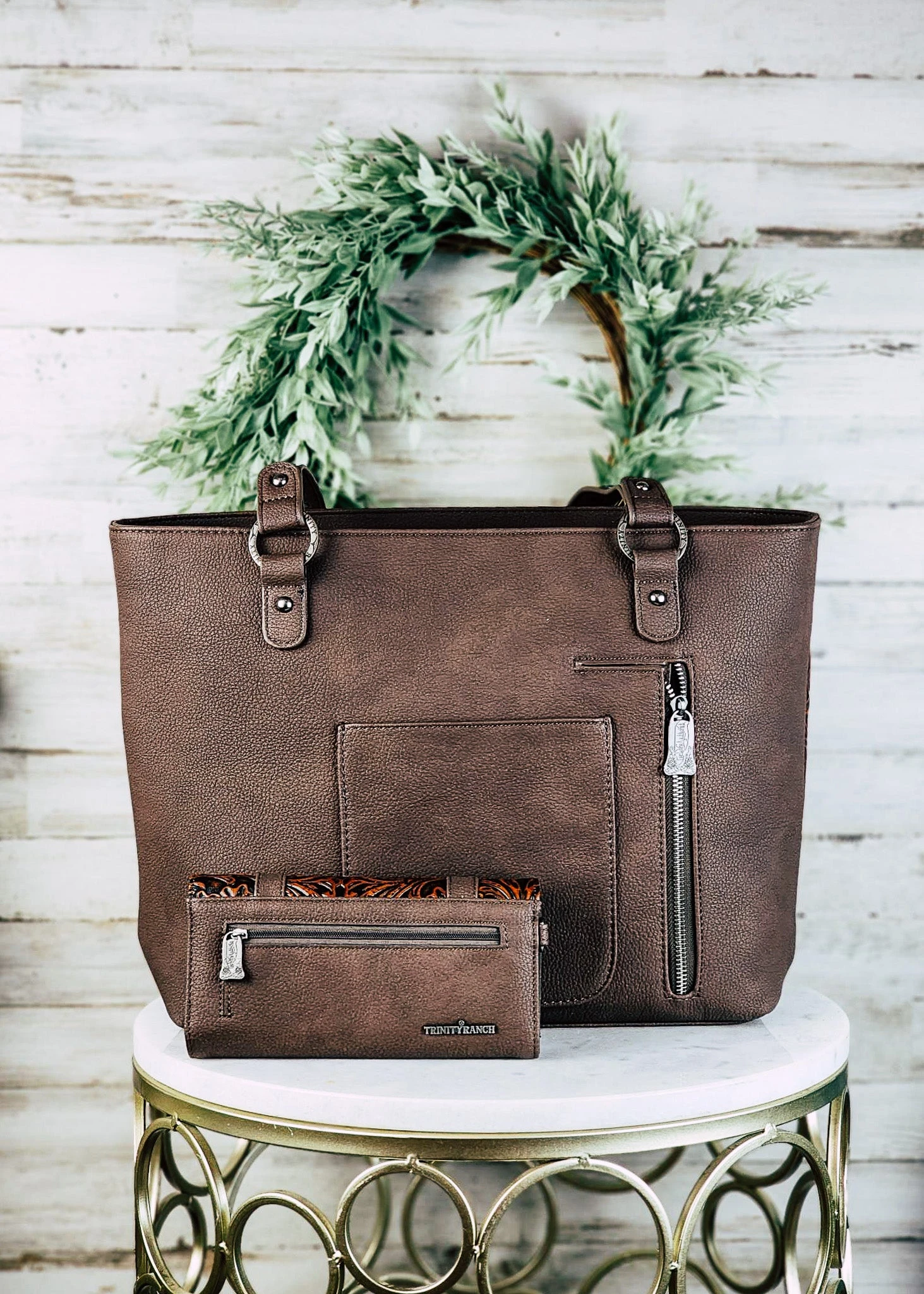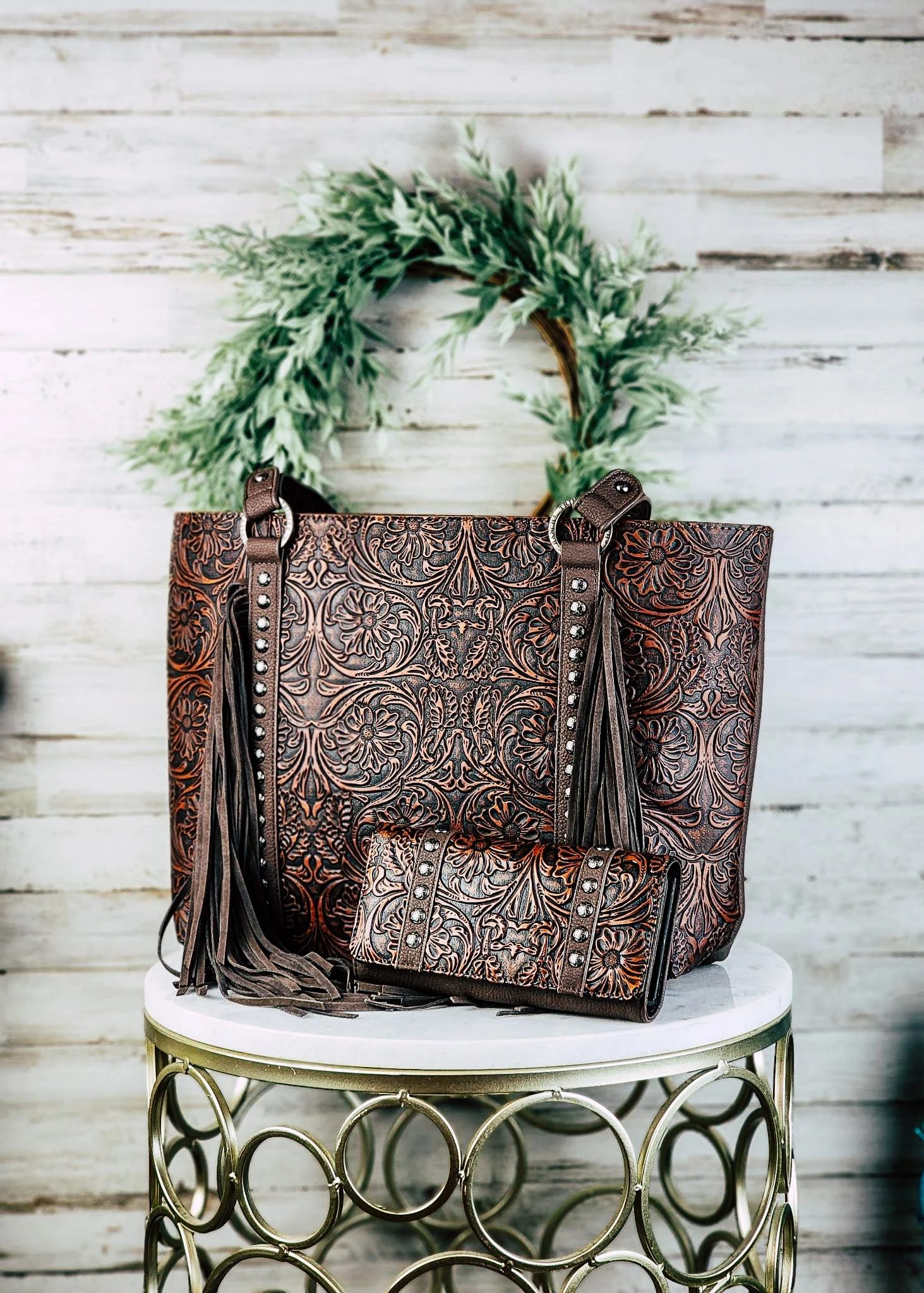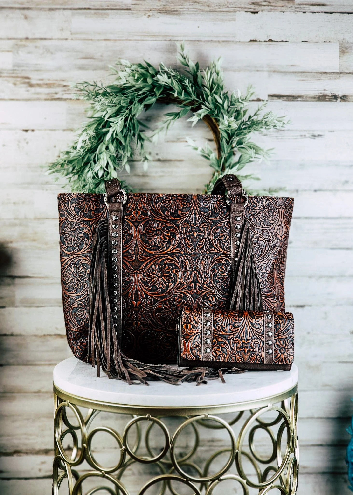 This beautiful tooled handbag will give you an instant western vibe with its gorgeous floral motif and genuine leather construction. It comes complete with a matching wallet and concealed carry features so you can tote your most precious items in style!