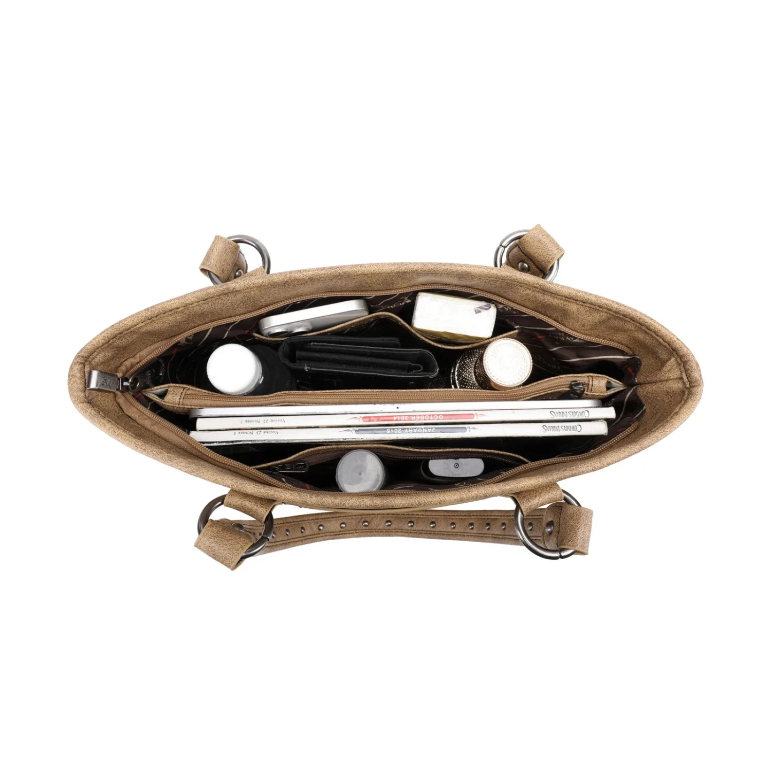 - Inside of the bag includes a zippered pocket and two open pockets