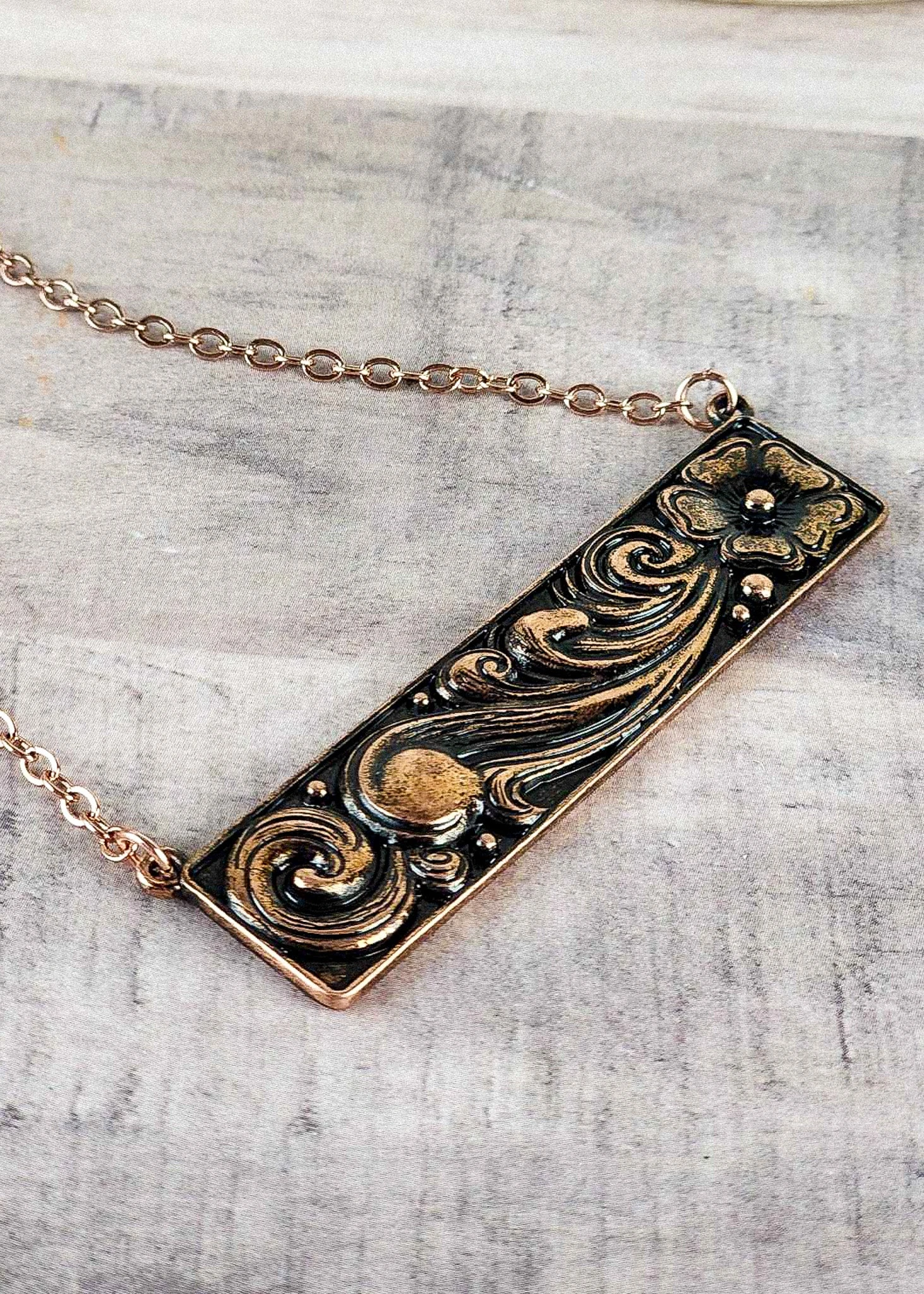 This Copper Floral Bar Necklace is the perfect symbol of femininity and sophistication for any occasion. Its delicate floral design will add a touch of elegance to your everyday look!