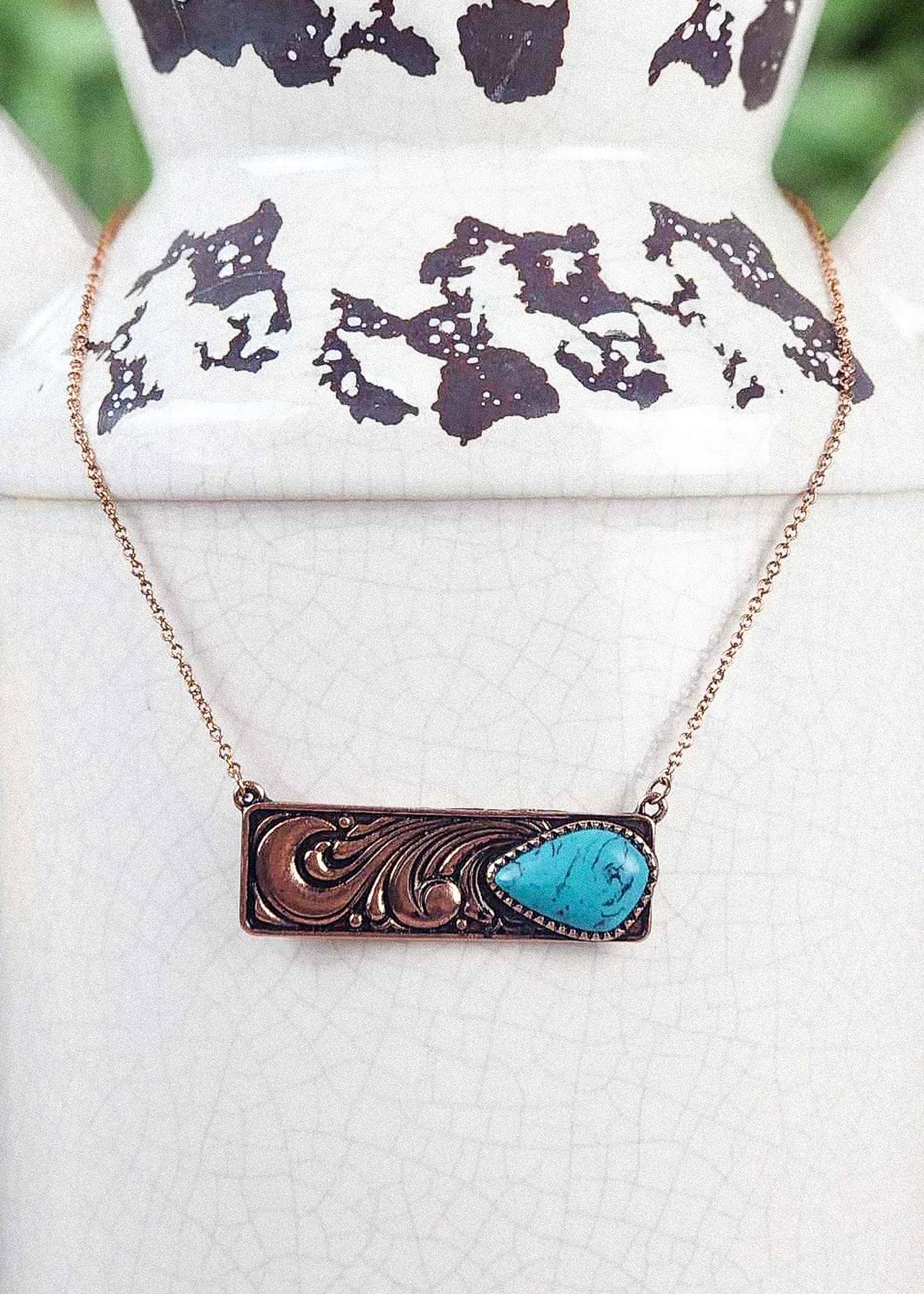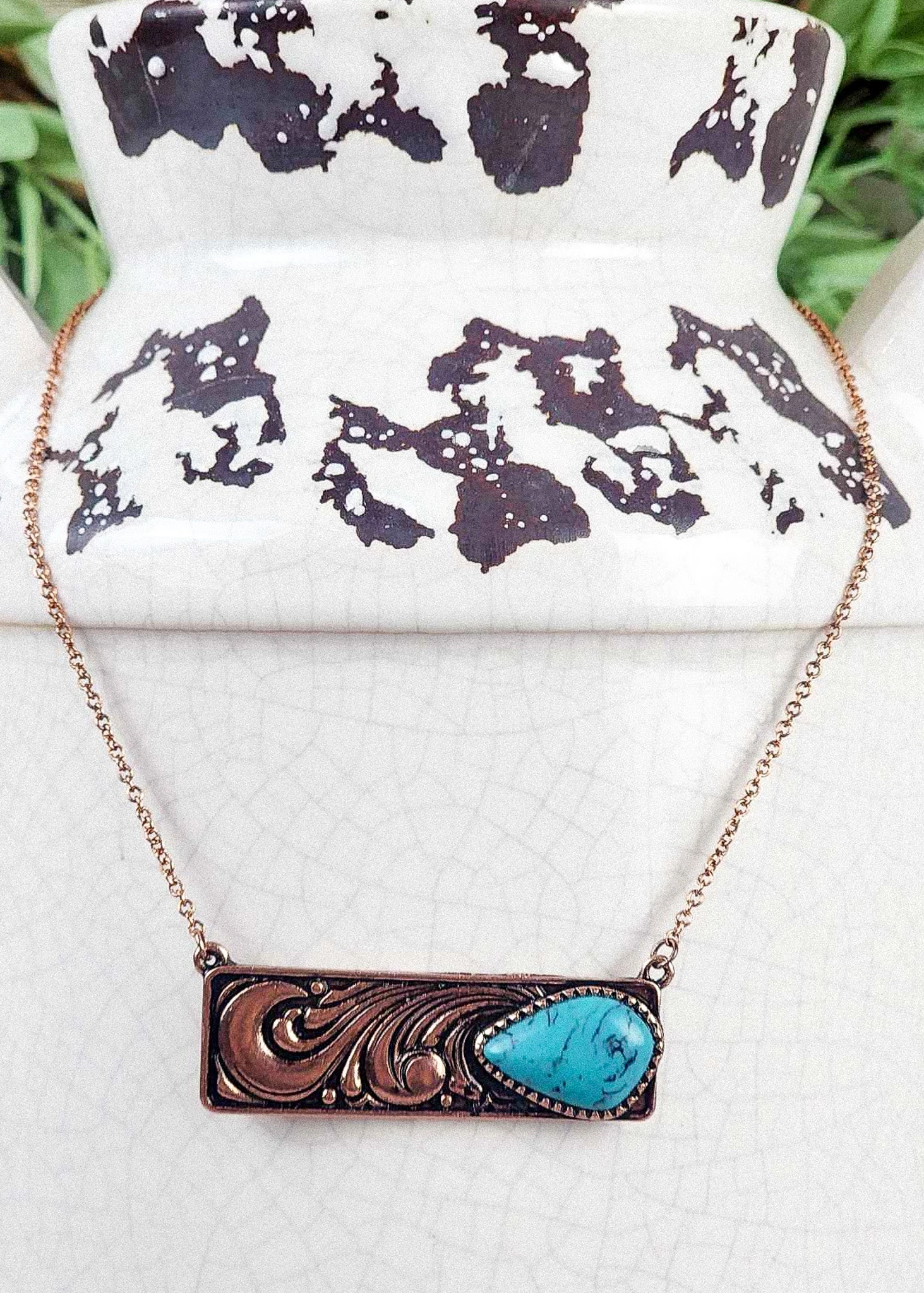 Treat yourself with this chic, western-inspired Copper Tooled Bar Necklace. Its tooled design and turquoise colored stone adds a flare of western to any outfit. Its classic look is sure to become a wardrobe staple!