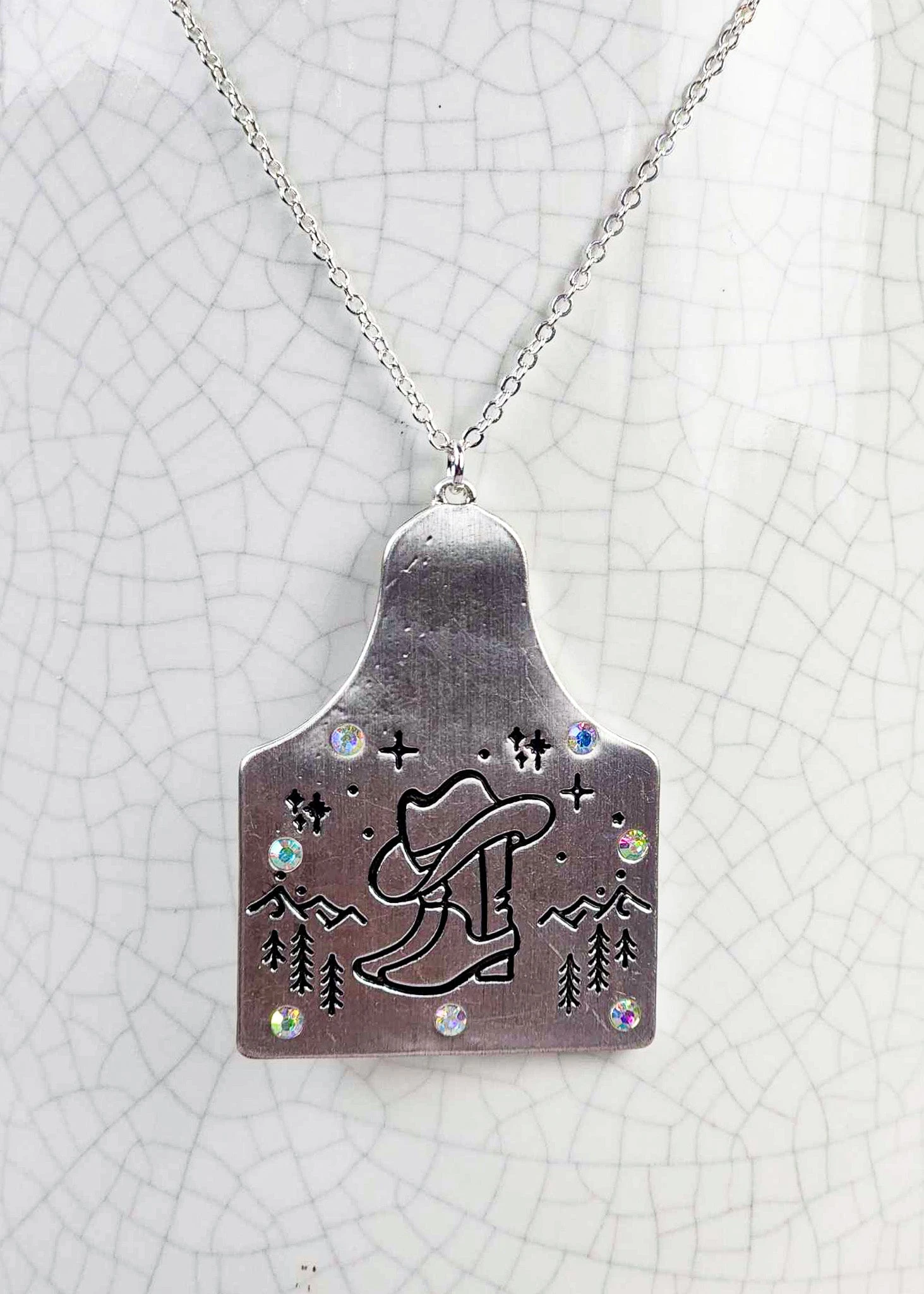 This Cow Tag & Boots Necklace is the perfect combination of cute and chic. Set in the mountains, this design is sure to stand out. The jewels add the perfect touch of color and glamour. A timeless, classic piece that will never go out of style!