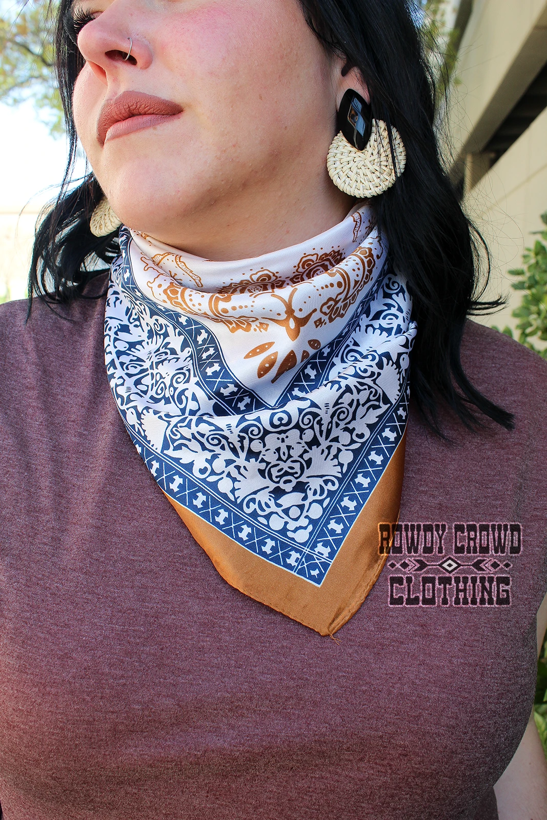 | Introducing the Cowboy Copper Wild Rag by Rowdy Crowd Clothing. This stunning women’s scarf is made from 100% polyester, measuring approximately 36″ x 36″. Its unique design and copper hue make it a standout piece in any accessory collection. Add this versatile piece to your wardrobe and let your style roar. |