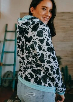 This Cowprint & Turquoise Fleece Zip Hoodie is perfect for the ultimate cowgirl! Super-soft and cozy fleece keeps you warm and comfortable – confidently face the elements in style!