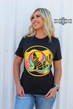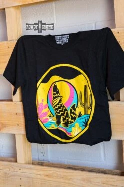 This Ghost Ranch Tee features a vivid image of a coyote in the desert, designed with an array of eye-catching colors including mustard, turquoise, and pink. Crafted from a lightweight, stretchy heather black tee, it is designed for a true-to-size unisex fit. Plus, the screen print won’t fade or peel after washing.