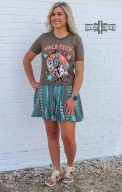 Hold Fast in this lightweight, stretchy heather brown tee, featuring a cowgirl bronc rider, stars, pinks, and turquoise. It is on a heather brown tee that is lightweight, stretchy and a true to size unisex fit and the design is a screen print, so won’t fade or peel after washing. Hold fast in style!