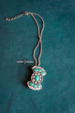 This timeless Honky Tonkin Necklace features a silver chain necklace with a concho pendant featuring a turquoise stone and intricate detailing. The chain is 16″ in length, while the pendant measures 2 & 1/4″ in length, 1 & 1/2″ wide and widest point. The perfect addition to your jewelry collection!