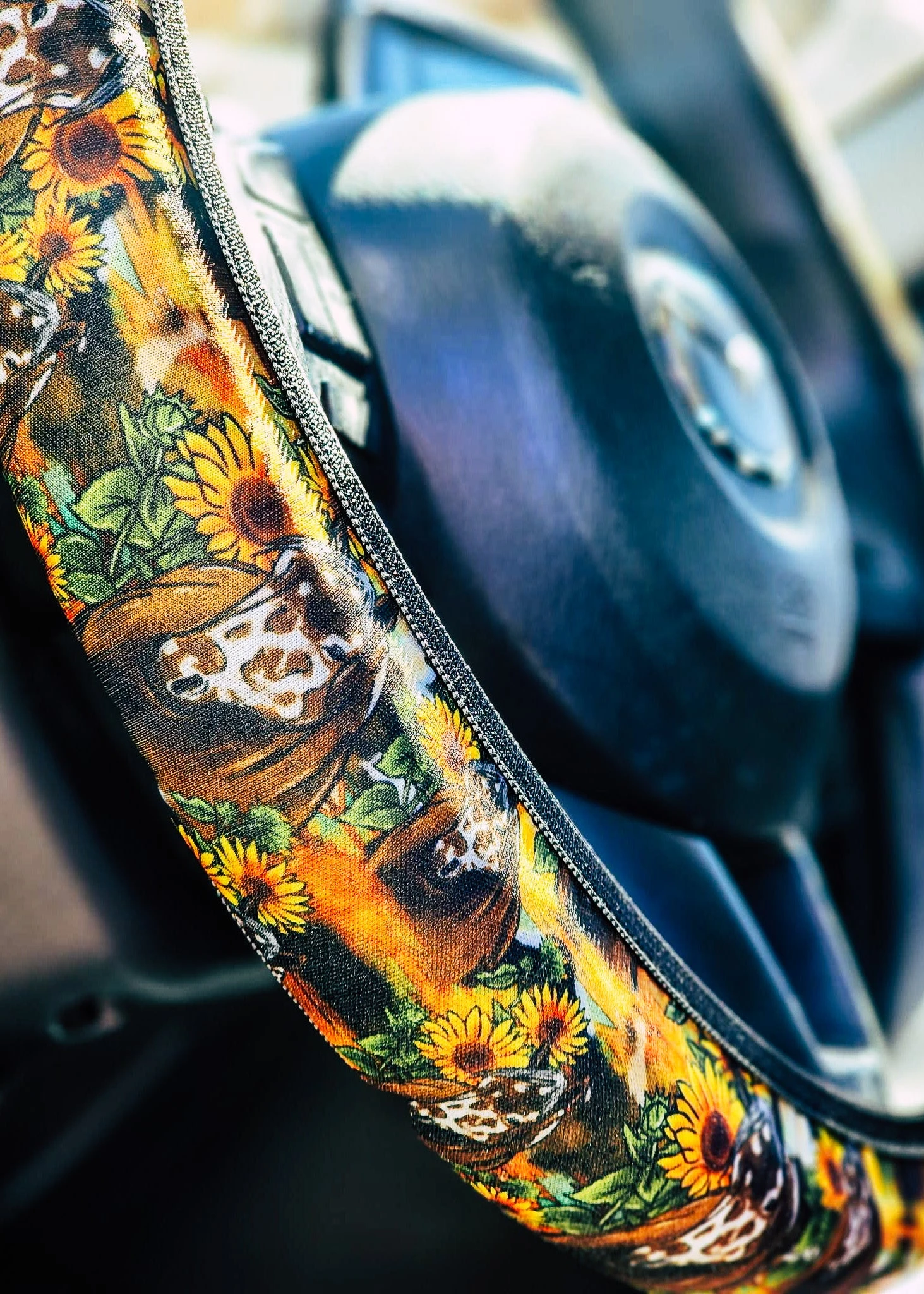 Keep that vehicle stylish with this horse & sunflower print steering wheel cover!
