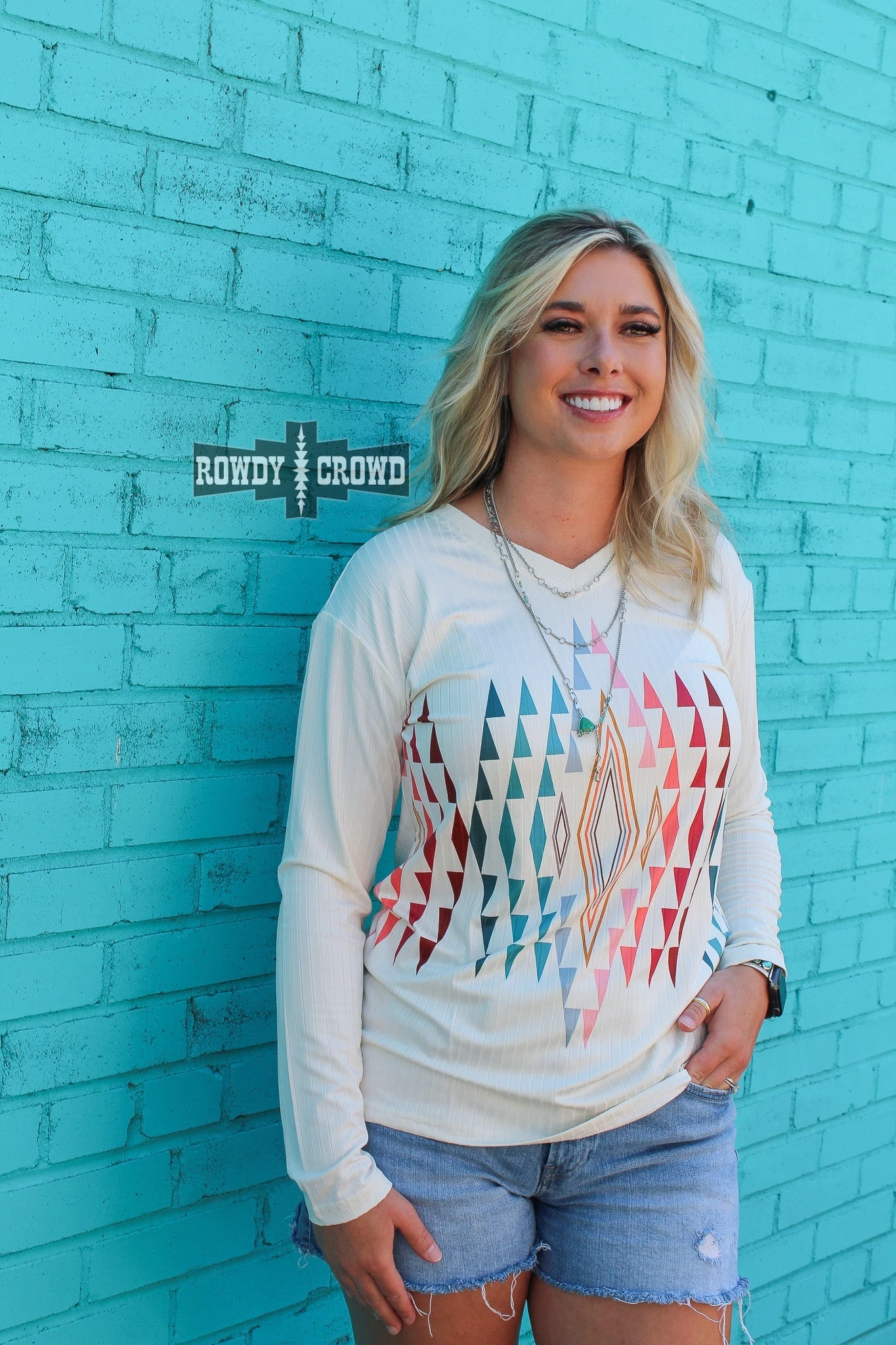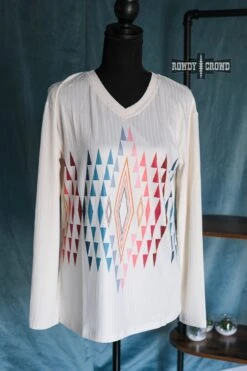 The Legend Long Sleeve Top is a cream, long sleeve top with a bright aztec pattern perfect to dress up or down. It features shades of blue & pink, and the material is extremely soft and stretchy!