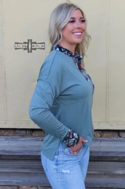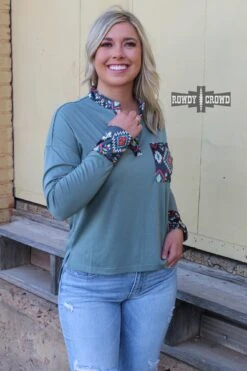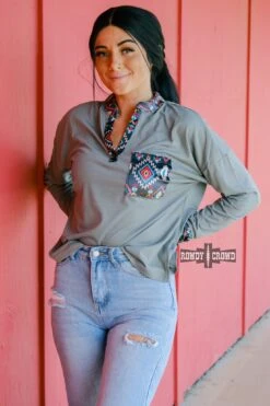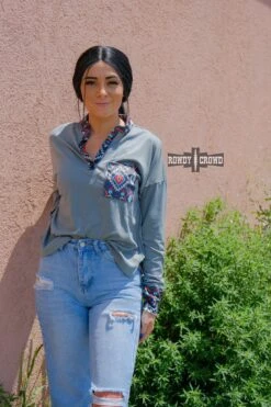 The Llano Estacado Long Sleeve is a comfortable, light weight top. With a heather dusty blue body and bright aztec detailing on velvet along the pocket, collar, and cuffs. Super soft stretchy material that is perfect going into the colder weather!