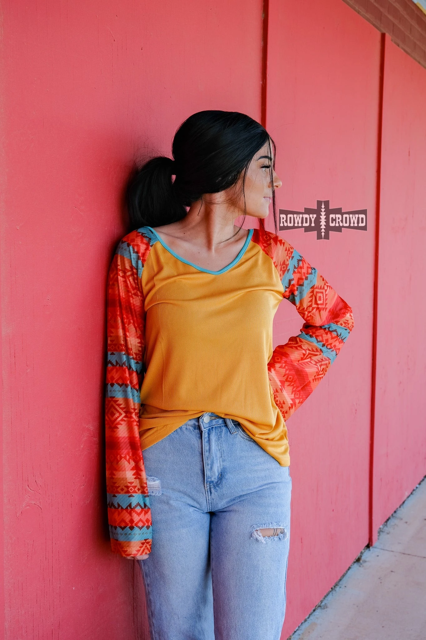 The Marfa Mesh Sleeve is a light weight v-neck with a yell body and colorful aztec print mesh sleeves. It a lightweight, soft, stretchy material that fits true to size!