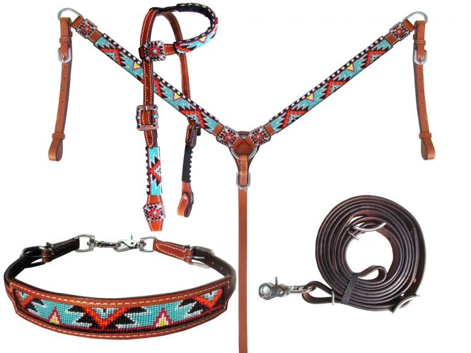 Beaded Aztec 4 Piece Set. This set features medium leather with a bright aztec beaded overlay with oranges, red, turquoise, and yellow beads. Set is accented with turquoise and red crystal rhinestone conchos and buckles. Set comes with one ear headstall, breastcollar, wither strap, and contest reins.