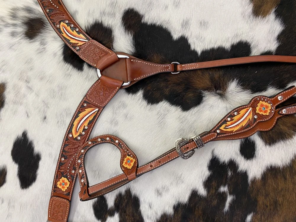Painted Floral and Feather design one ear bridle and breast collar set with silver and rhinestone bead accents. This medium oil floral stamped set features a floral and feather painted design on the breast collar and one ear headstall with a black painted accent in the floral tooling, accented with silver and rhinestone beads, Set has silver hardware * 7FT REINS INCLUDED*