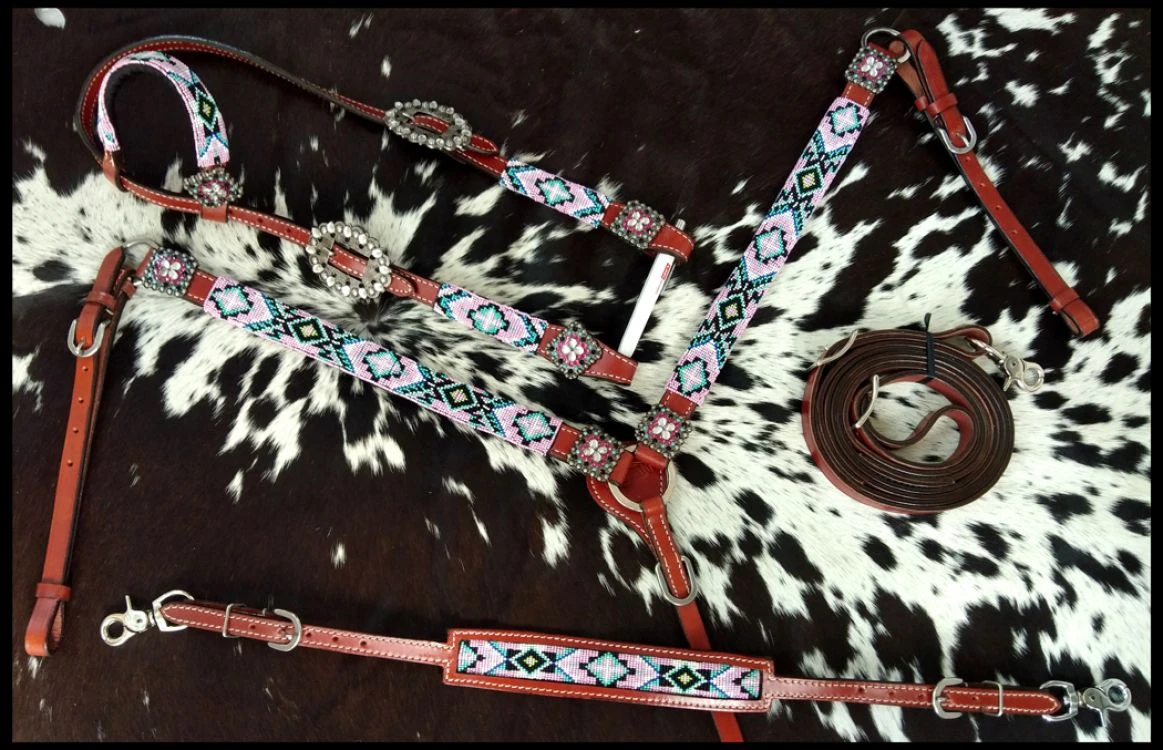 Pastel Beaded 4 Piece Headstall and Breast collar Set. This set features medium leather with a pastel beaded southwest design print on the beaded overlay. Set is accented with silver Conchos with pink and turquoise accent stones and buckles. Set comes with single ear headstall, breast collar, wither strap, and contest reins.