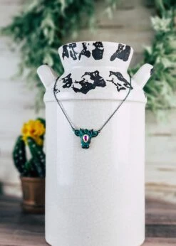 Make a bold statement with a beautiful Turquoise Cow Necklace! Featuring a turquoise charm, this unique necklace will add a fun and playful touch to any outfit. Wear it alone or layer it with other pieces to make a stunningly stylish statement. What will you create? Approx 16″
