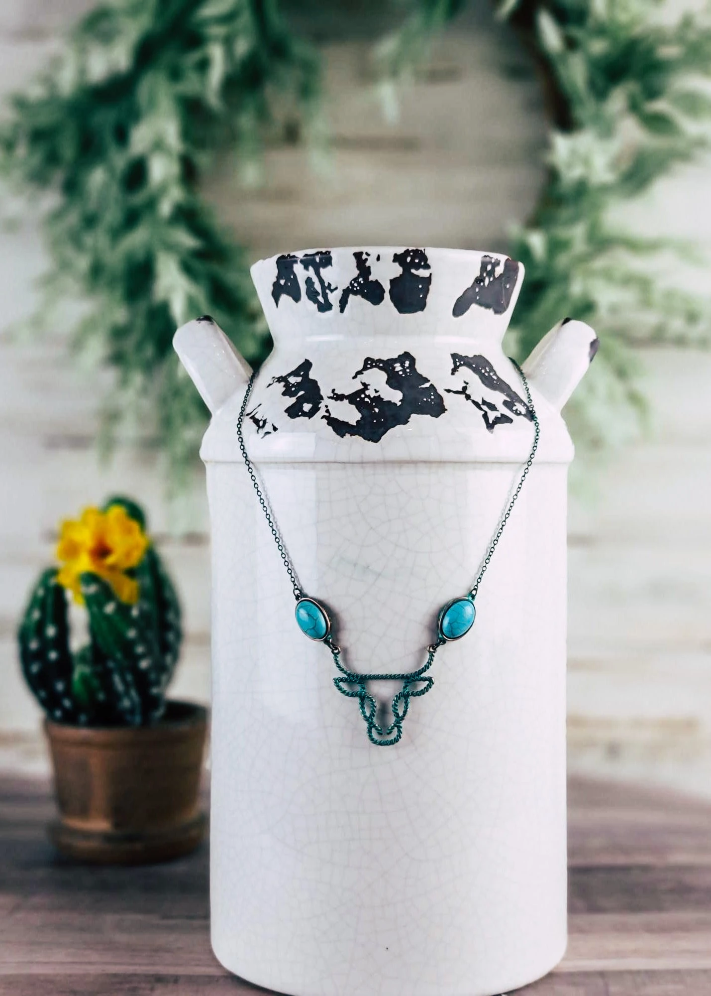 Be unique and express yourself with this eye-catching Turquoise Cow Necklace! It’s delicate design is just enough to add a touch of beauty to your wardrobe! Approx 16″