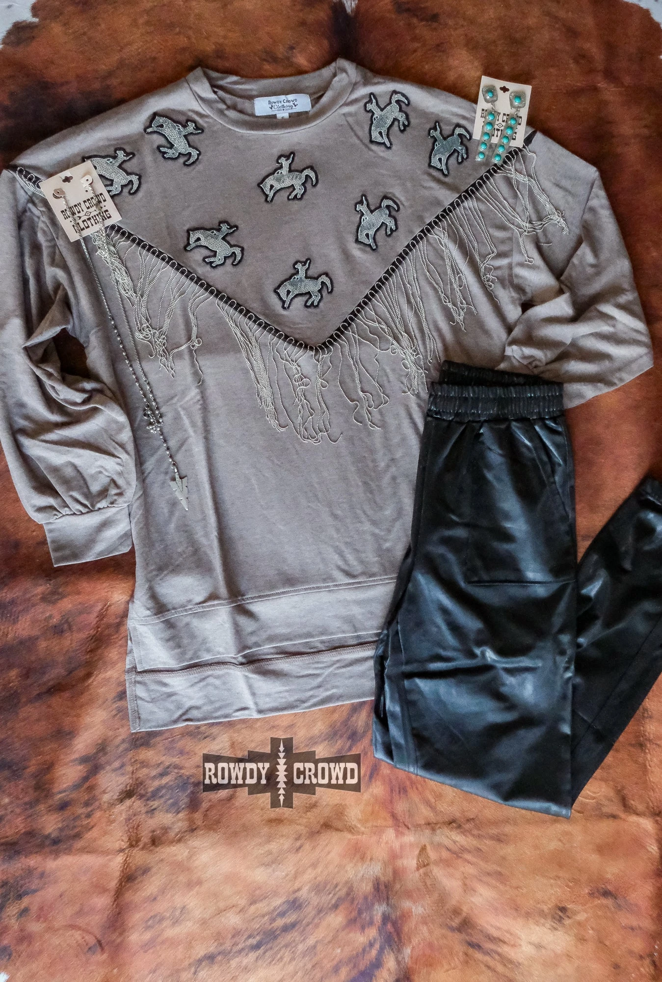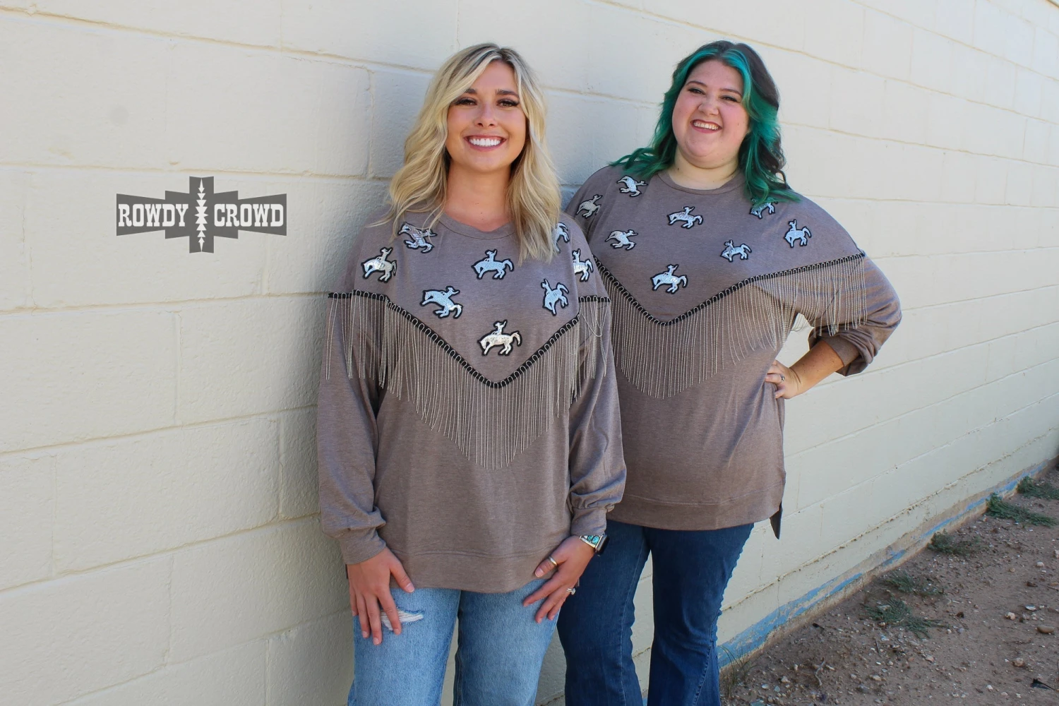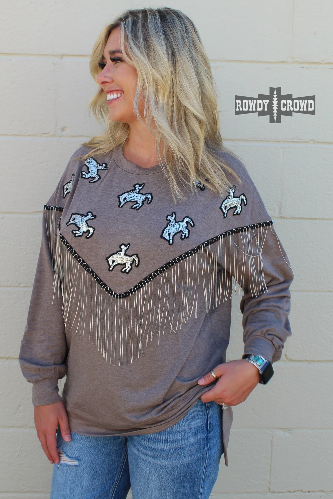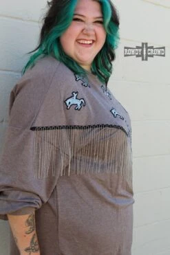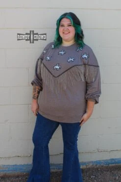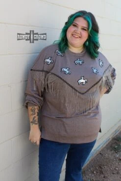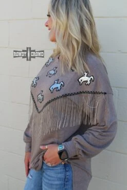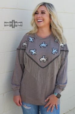 The Roughstock Sweater is the perfect example of comfy & cute. Its darker gray base lets the silver sequin bronc patches shine and the silver fringe stand out. The side slit and longer back allow for comfortable wear tucked & untucked. A must have for this fall & winter.