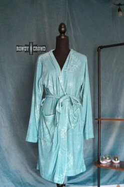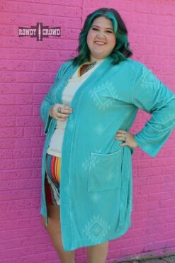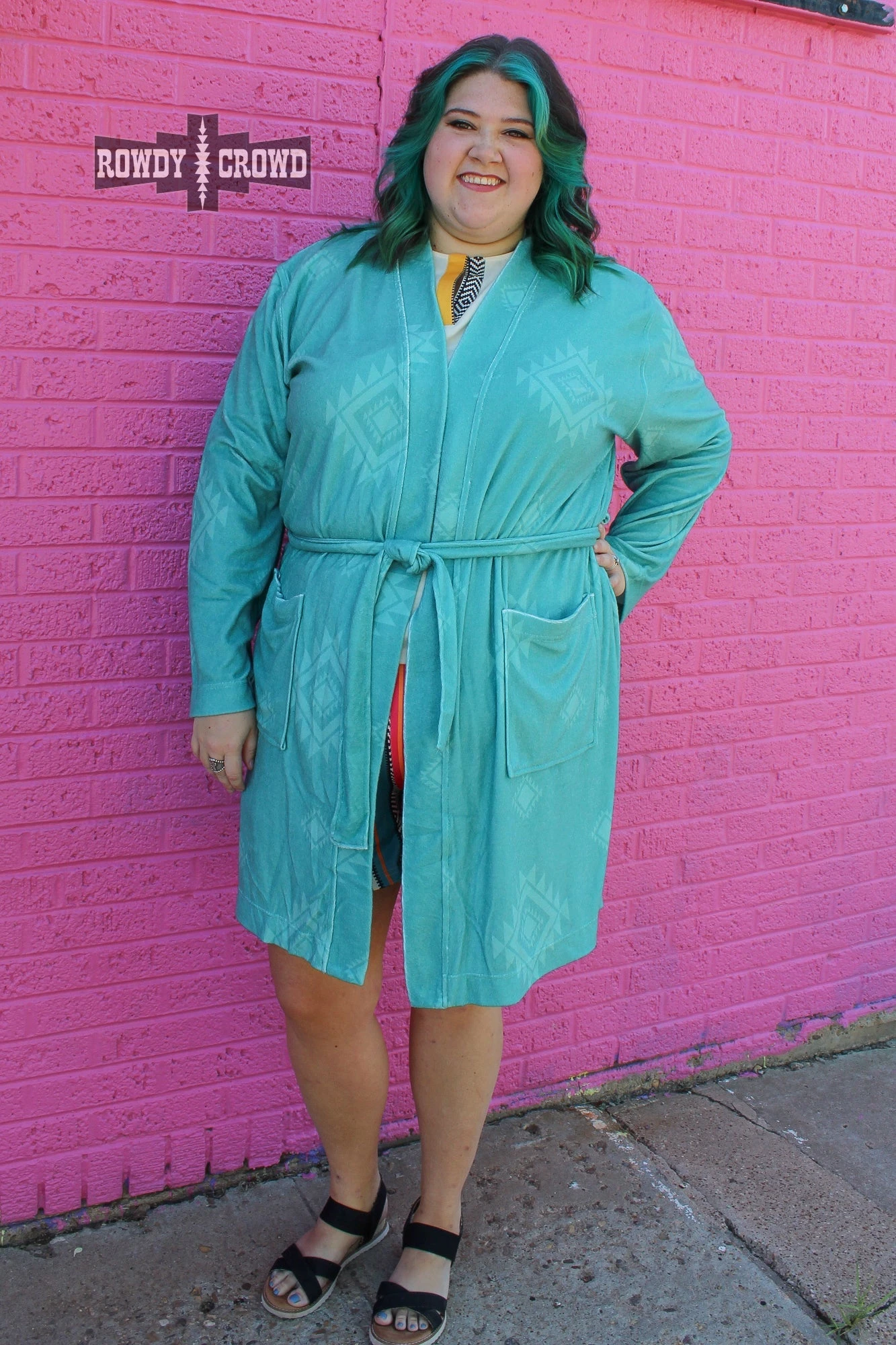 Your new favorite robe, with its bright turquoise color, deep pockets and lighter turquoise aztec print. It is a comfy, soft true to size fit!