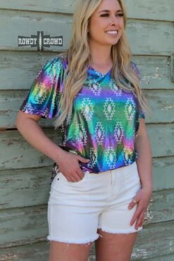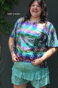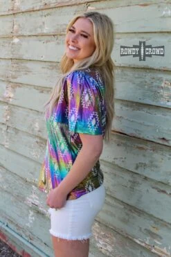 Stand out in the Shimmer Me Timbers Top! This top sparkles with rainbows of metallic colors for a wild, unique look. The white aztec print bring a classic touch to the mix. The fit is true to size, for a comfortable fit that shows off your style.