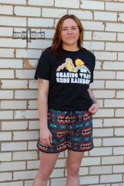 Comfortable and cute athletic shorts with a bright aztec print on a gray base. Shorts feature an elastic waistband and drawstrings for the perfect fit. Also has inner lining for ultimate comfort!
