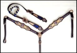 Beaded Southwest Design 4 Piece Set. This set features medium leather with a with a Southwest beaded overlay with red, brown & turquoise beads. Set is accented with silver conchos with red & turquoise beads as well as on buckles. Set comes with single ear headstall, breastcollar, wither strap, and contest reins.