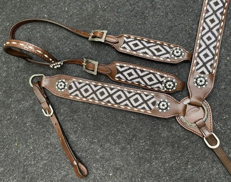 Southwest Woven Fabric One Ear Headstall and Breast collar Set. This set features Dark oil leather accented with a Black & White southwest woven inlay, rawhide lacing and has bling conchos to match. Set includes one ear headstall, breast collar, and comes with 5/8″ x 7′ leather split reins.
