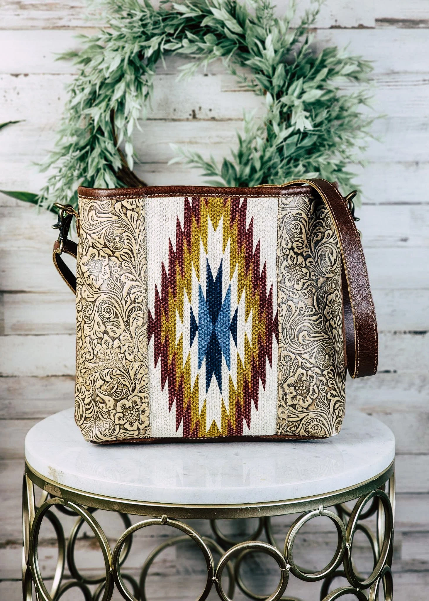 Make a statement with this unique and stylish Aztec Crossbody Handbag! This chic piece is the perfect way to bring a bit of vibrant dynamism to your daily look. With its high-quality leather and suede construction, this bag will be your companion for years to come.