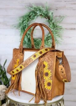 Carry all your essentials in style with this one-of-a-kind Sunflower Cowhide Tote Handbag. Featuring a unique sunflower pattern and made of sturdy cowhide, this stylish tote is perfect for the office, a night out, or your next adventure! Show off your western flair with this beautiful statement piece.