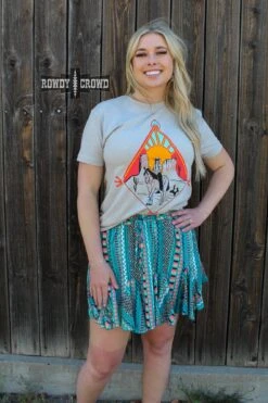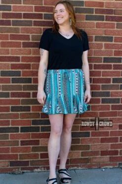 The Sunnyvale Skort features a turquoise base with bright, colorful, southwestern style pattern. Its flowy silhouette is complemented by a stretchy waistband and drawstring for all-day comfort. The perfect statement piece for your wardrobe.