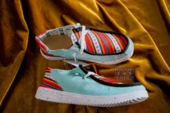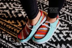 Introducing the Sunset Serape Shoes – a lightweight, canvas shoe featuring a turquoise base with an eye-catching neon serape and detailed aztec print. The interior of the shoe is accented with white, grey and turquoise arrows, completing the unique look. These shoes fit true to size, but for a more fitted shoe size down, or size up for a more relaxed fit. Plus, they’re designed to be machine washable for easy care.