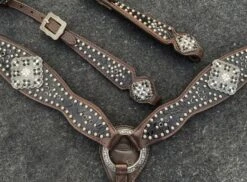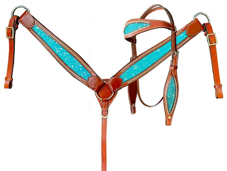 Medium Oil Teal Acid Wash Cowhide Inlay Browband headstall and breast collar set. This set features a medium colored leather with an acid wash splatter hair on teal cowhide inlay and silver beading. Headstall comes with 5/8″ x 7′ leather split reins.