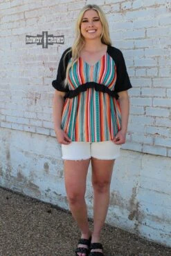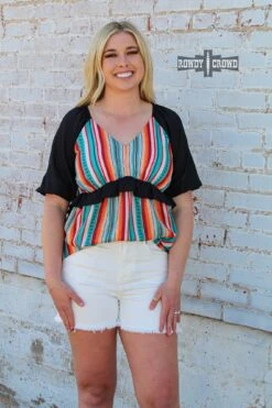 The Beth Blouse is sure to make a statement. This lightweight serape fabric is full of color to brighten up any ensemble. Subtle black details provide the perfect contrast to create an eye-catching piece to dress up or down.