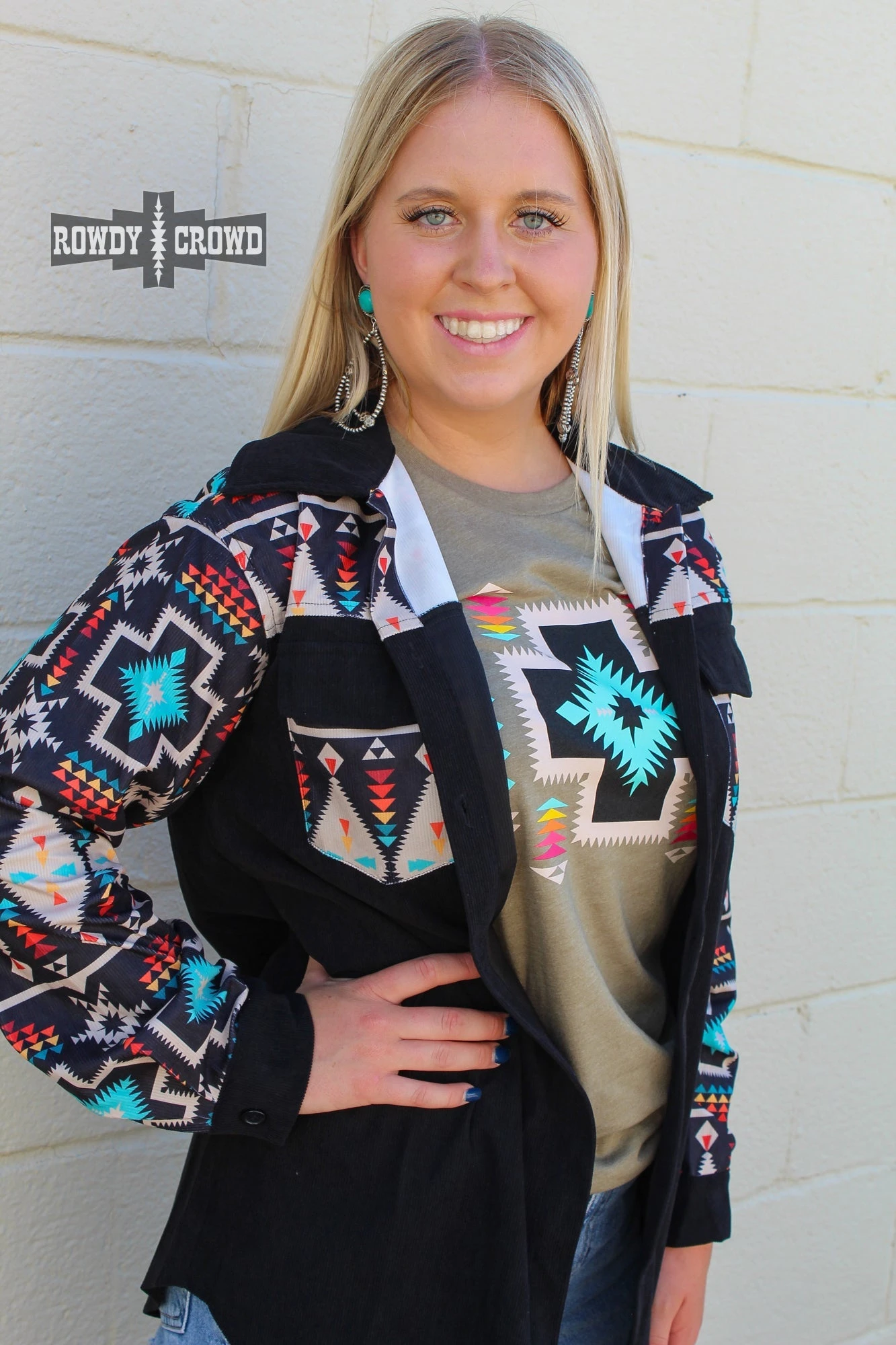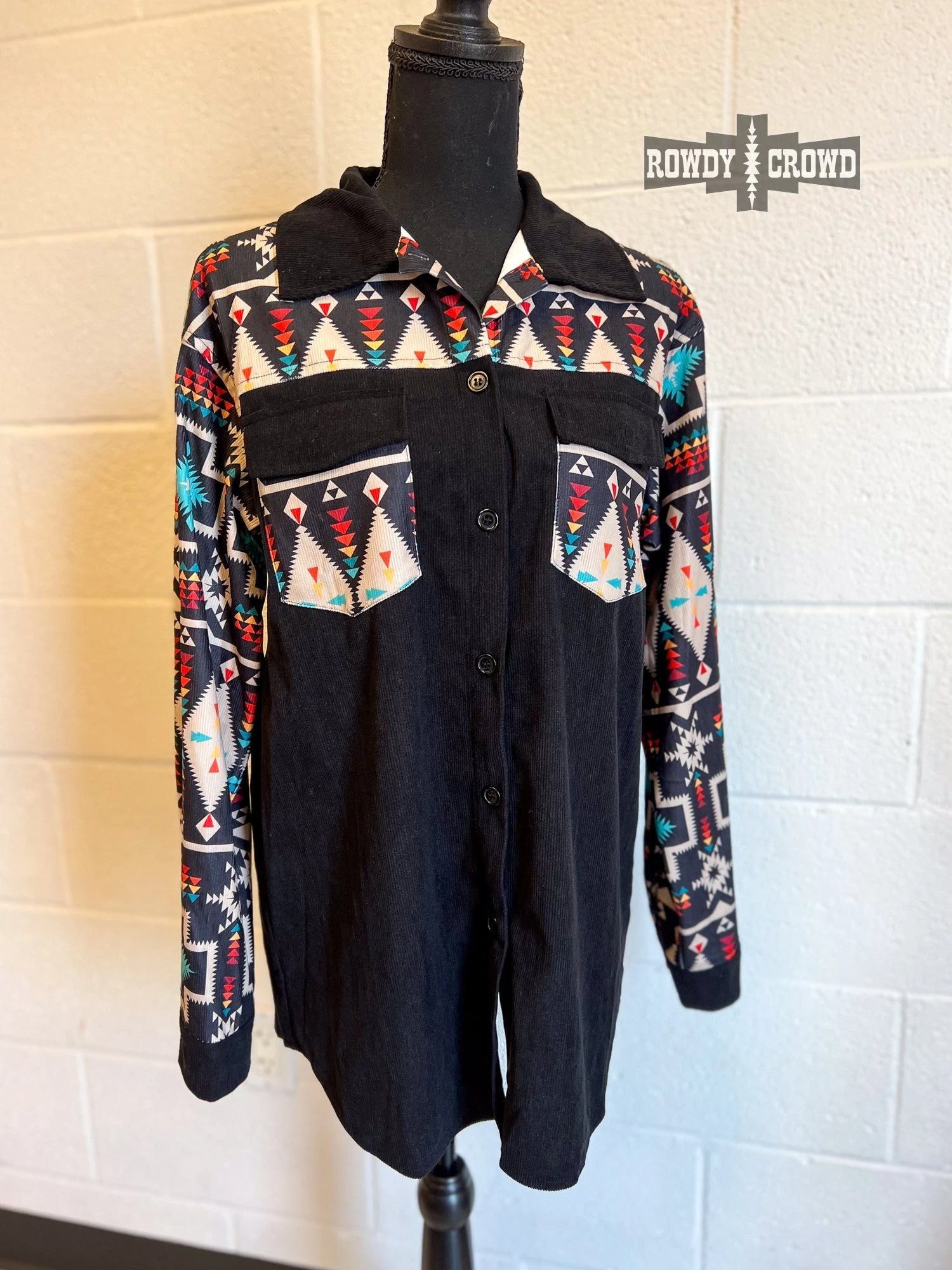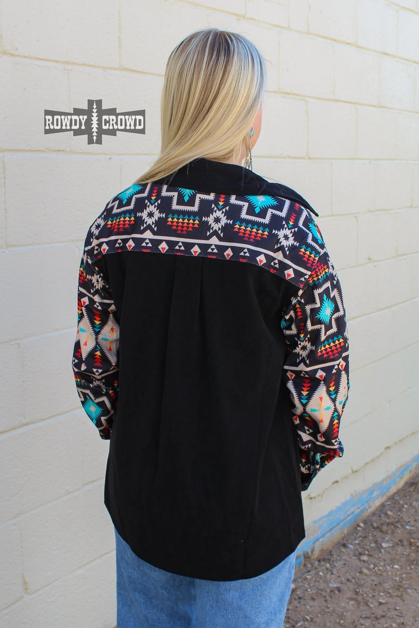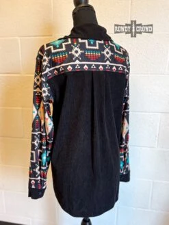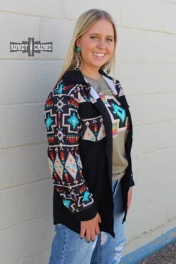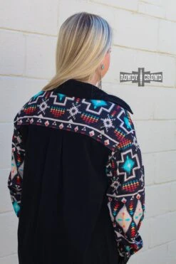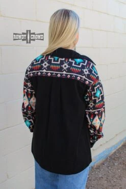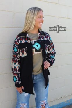 The Wild Side Shacket is the perfect piece to throw on to stay comfortable and cozy. This shacket has a black base with bright Aztec pattern accents. Can be worn as a button up, or an open shacket over a tee!